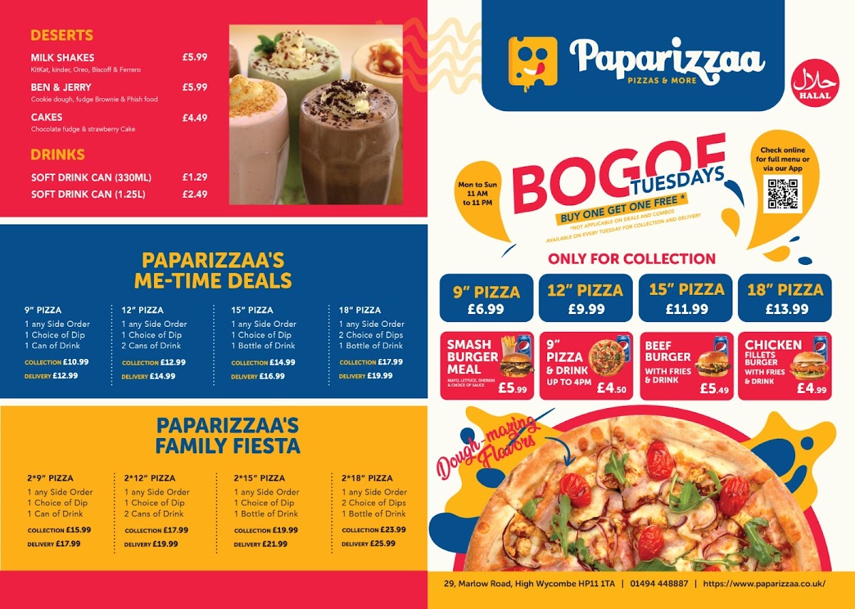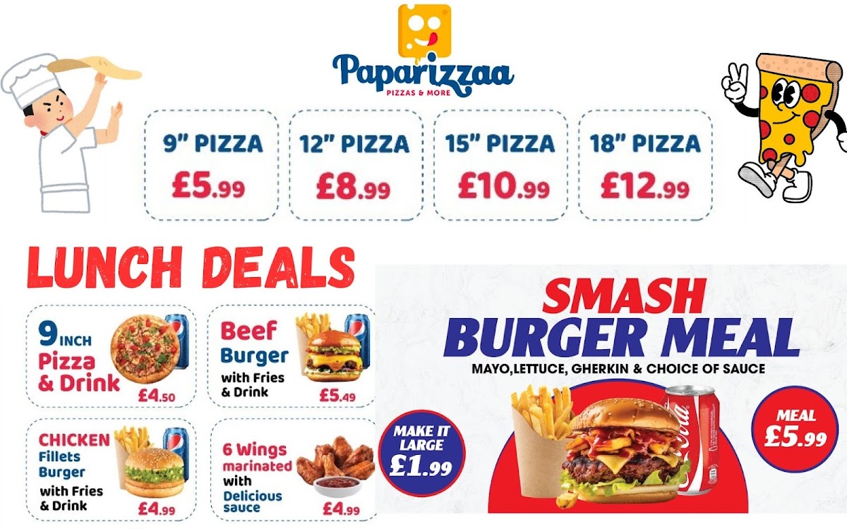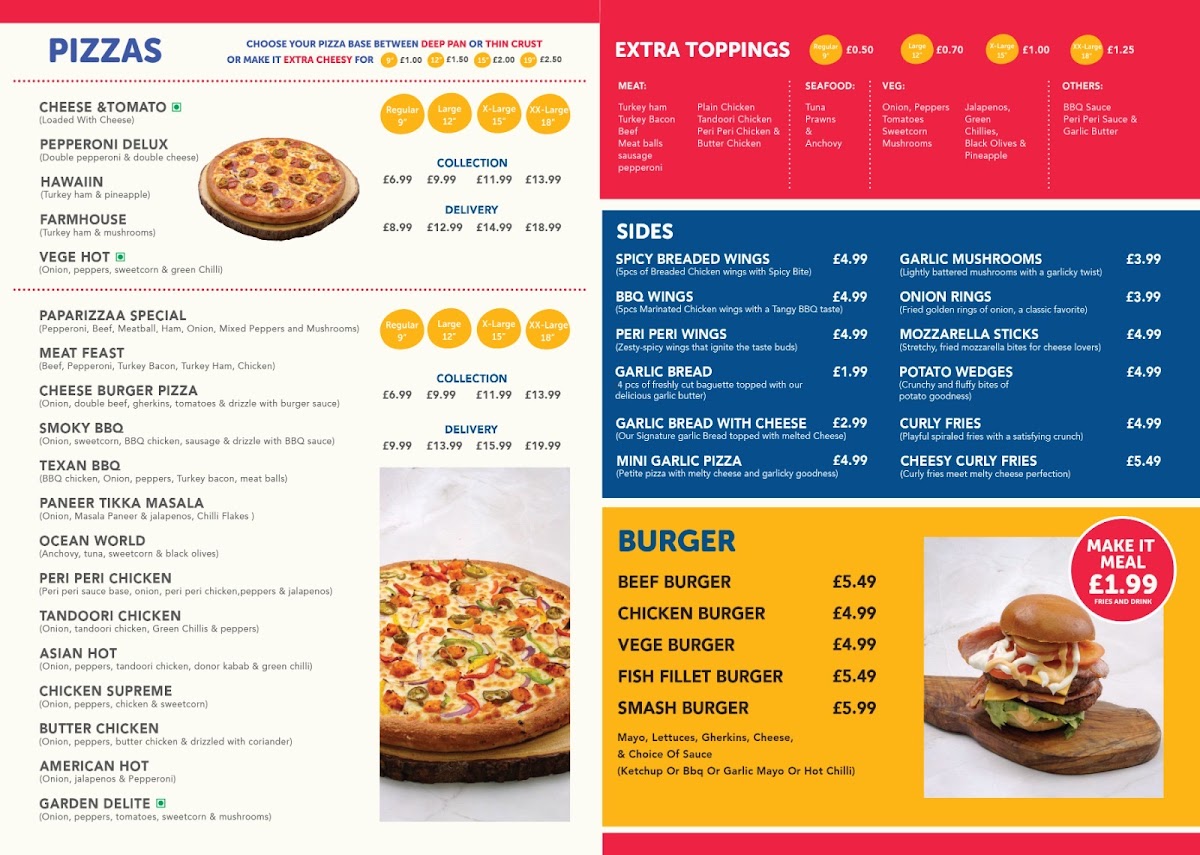 Paparizzaa - High Wycombe offers a delightful array of dishes that cater to a variety of tastes. The Chicken Supreme Pizza stands out with its rich combination of tender chicken and flavorful toppings, making it a top choice for pizza lovers. For those looking for something spicy, the Jalapeno Poppers are a must-try, delivering a perfect balance of heat and crunch. Another classic on the menu, the Pepperoni Pizza, is a crowd-pleaser, with its crispy crust and generous layer of pepperoni. If you're in the mood for customization, the CYO-Prawns with Some Veggie offers a unique option to tailor your pizza with fresh prawns and a selection of vegetables. For a quick snack or appetizer, the Chicken Nuggets and Hamburger provide satisfying, comfort-food options. And if you're craving a sweet finish to your meal, the Banana Cue adds a touch of sweetness with its caramelized banana dessert. Whether you're after a hearty meal or a light bite, the diverse menu at Paparizzaa has something to satisfy every craving.